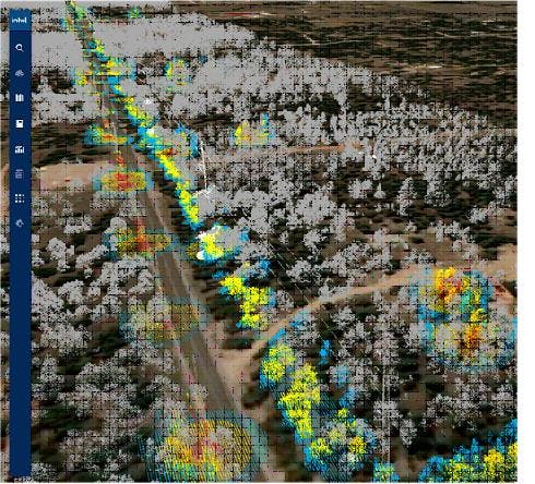 Identifying vegetation encroachments around electrical poles with a LiDAR point cloud in the Intel Geospatial platform.