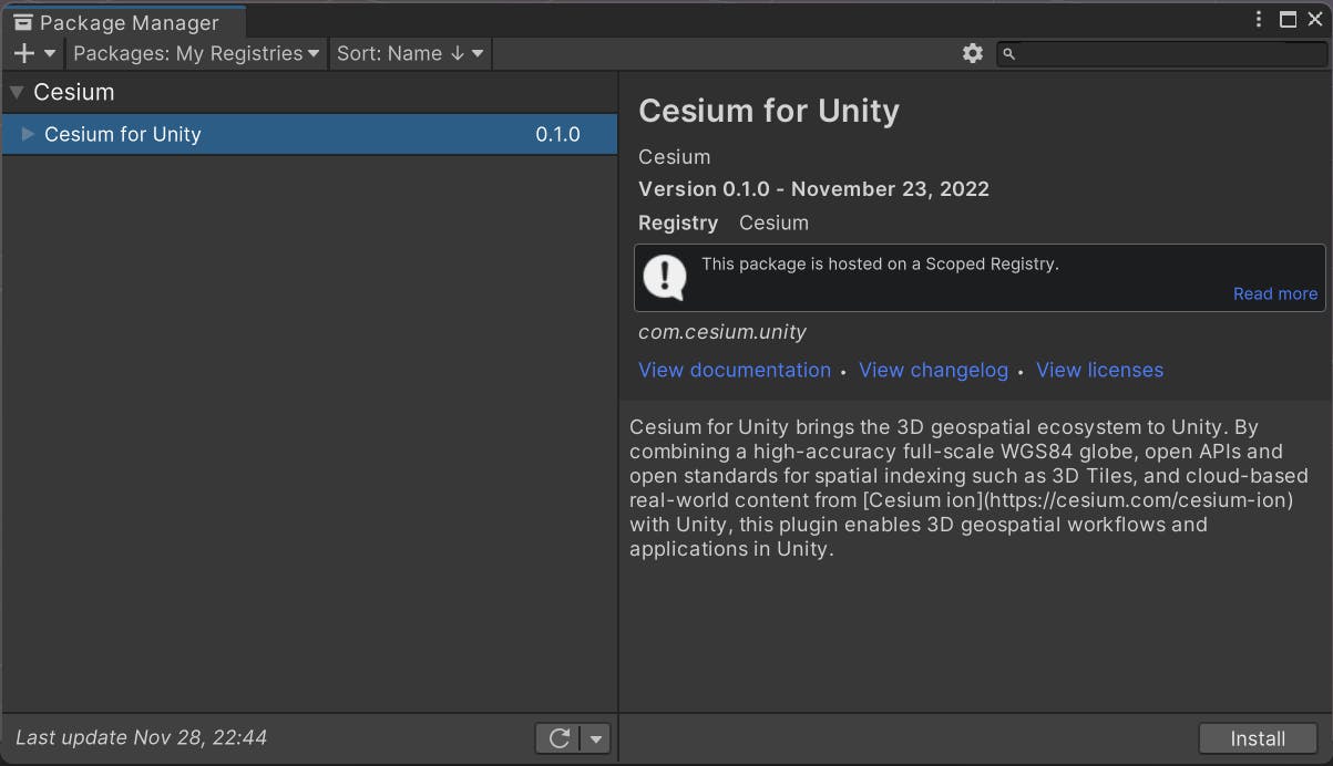7. Cesium for Unity will appear in the package list. Click on it, and then click Install. Cesium for Unity and its dependencies will be downloaded and installed.