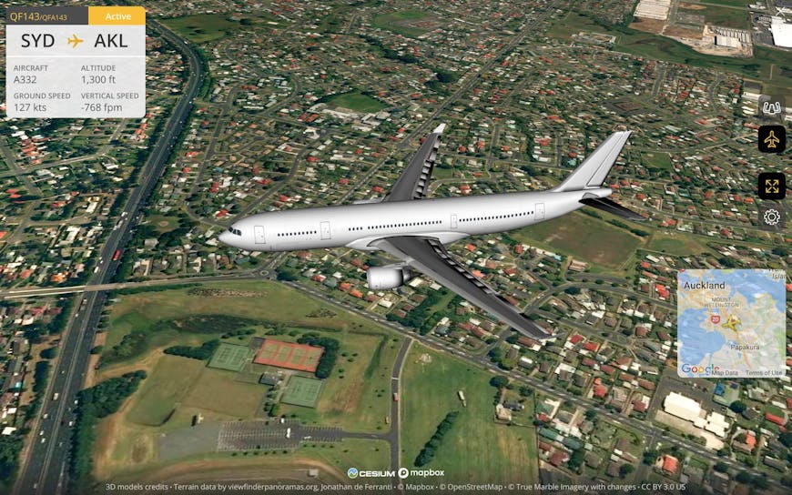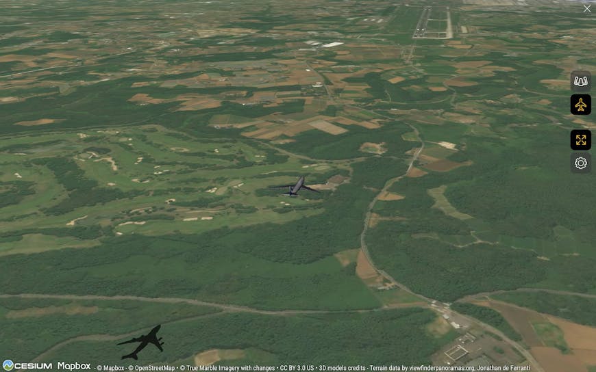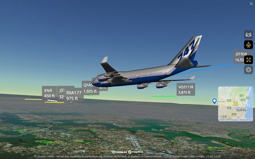 Flightradar24’s 3D view, available in both the browser and mobile apps, is built with CesiumJS. The app shows the real-time location of flights, collected from terrestrial and satellite-based ADS-B transponders, radar, and more.