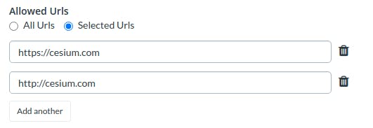 By default, your access tokens can be used from anywhere and by anyone. You can make your token more secure by specifying one or more “Allowed URLs” from which the API request can originate. This is recommended for a token added to a public client to prevent your token from being used outside your app. This feature is only applicable to hosted web apps, and should not be set for tokens used in Cesium for Unreal.
