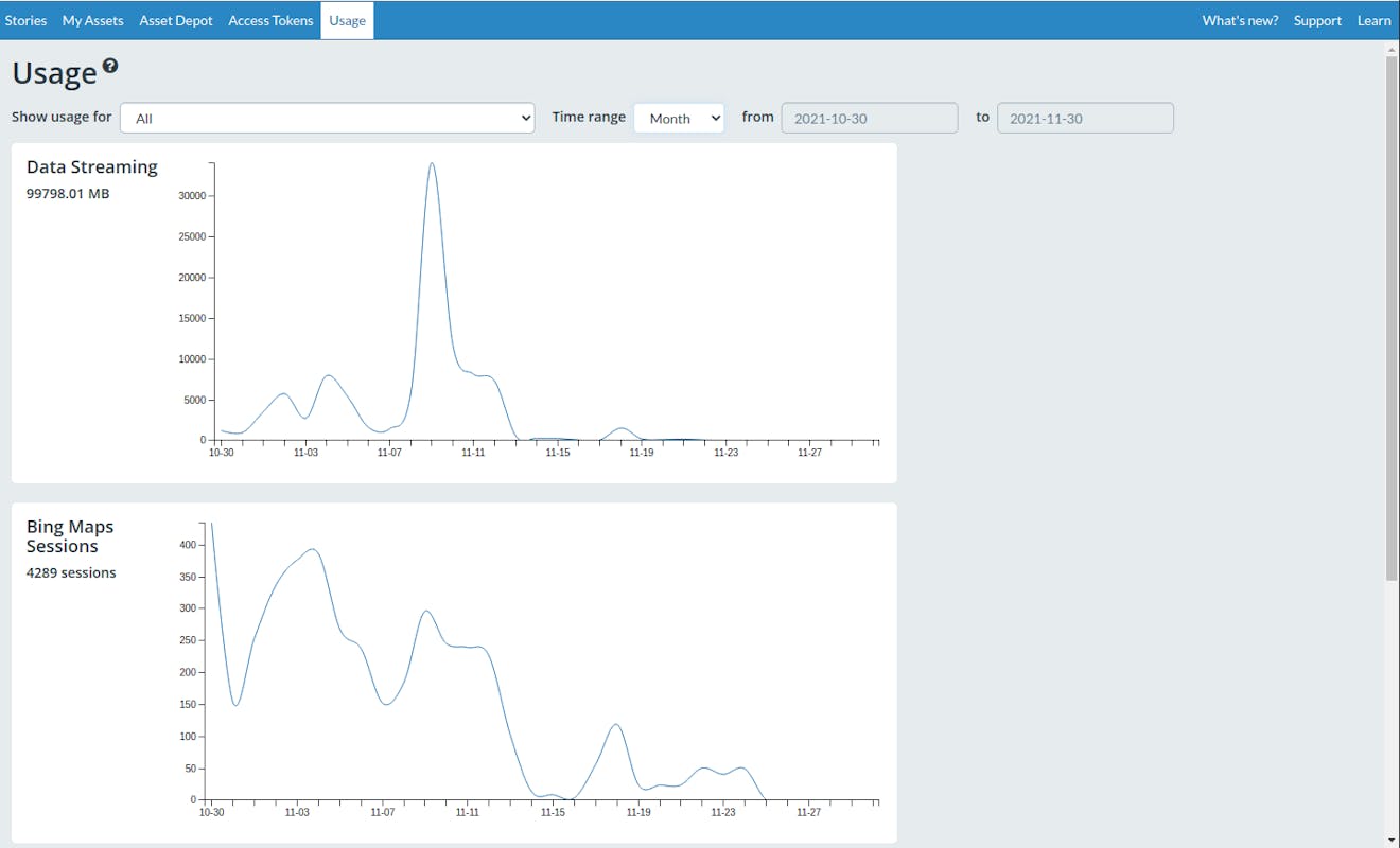 Access tokens are used to track your account usage, including streaming, bing sessions, and geocodes. You can view both your total account usage and view usage per token on the usage page of the ion dashboard. Use the “Show usage for” drop down above the tables to select a particular token. Tracking usage is helpful to determine which of your applications is getting the most use, or if there’s an unexpected surge in usage from one of your tokens. Learn more about usage in our Optimizing Quotas guide.