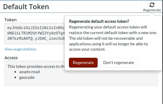 If you accidentally share your default token or otherwise think it is being used without your permission, you can regenerate it by clicking the ‘Regenerate’ button on the access tokens page in the ion dashboard. This will create a new default token and permanently revoke your previous one so apps using the old token will no longer be able to access the ion API.