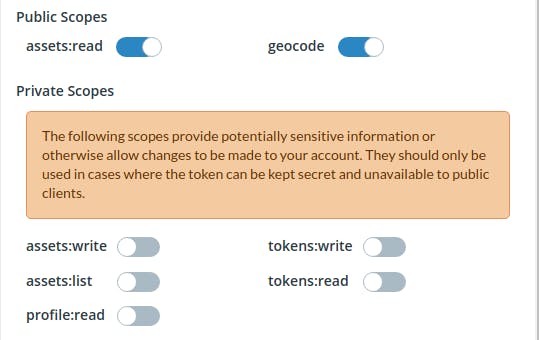 When choosing scopes, enable the minimum set of scopes needed to accomplish your particular task. For example, if you want to automate asset uploading, you should create a token that only has the assets:read and assets:write scopes. You should then create a token with just the assets:read scope for viewing the assets in an app.