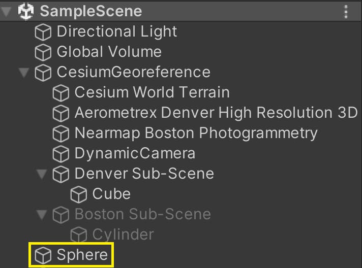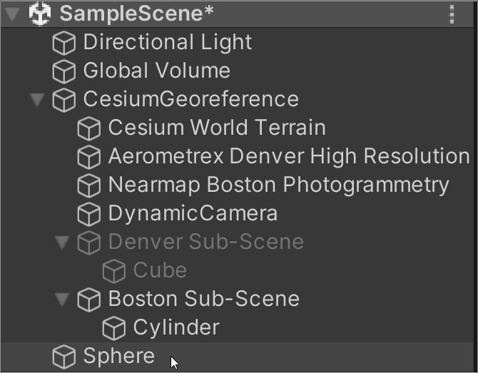 The Cube and Cylinder are toggled correctly, but the Sphere appears in both scenes. Since the Sphere does not belong to any sub-scene, it is not disabled when you switch. It also does not have a CesiumGlobeAnchor component, which would otherwise anchor it to the globe without needing a sub-scene. These factors cause the sphere to “travel” with you as the georeference origin changes.