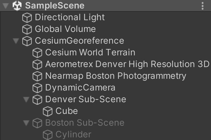 Because sub-scenes are intended to georeference objects that are not compatible with globe anchors, you do not need to add anything that is already georeferenced to the sub-scene. This includes 3D Tilesets or objects with a CesiumGlobeAnchor (such as DynamicCamera). However, it can be useful to place georeferenced objects in sub-scenes anyway. For example, imagine a level with two sub-scenes, each at a different city. The first city contains a photogrammetry dataset, while the second uses Cesium OSM Buildings. Cesium OSM Buildings is a global tileset, so the first city’s photogrammetry may be obscured by the buildings. If you put the Cesium OSM Buildings under the second sub-scene, they would appear only in the second city’s sub-scene. Only the photogrammetry will be visible in the first city.