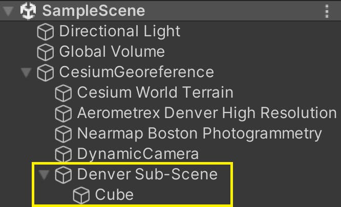 Georeferenced sub-scenes become more useful once you build your local scenes inside of them. In Cesium for Unity, a game object is considered part of a sub-scene if its parent object has a CesiumSubScene component. This tutorial will demonstrate how this works by placing a cube in the sub-scene in Denver.