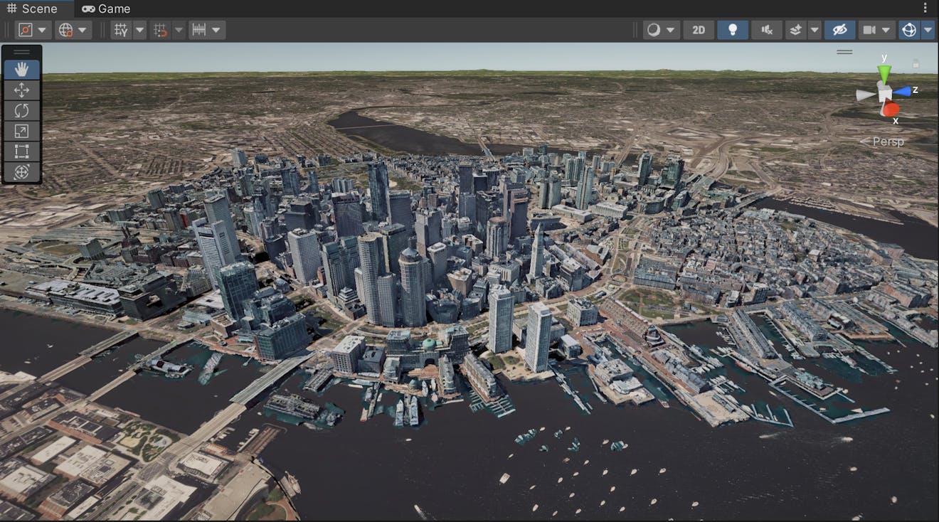 2. Next, add two photogrammetry datasets of your choosing. This tutorial demonstrates how to place sub-scenes around the Aerometrex Denver Photogrammetry and Nearmap Boston Photogrammetry datasets. Some parts of the Nearmap Boston Photogrammetry tileset clip into the ground, so make sure to offset the Y-coordinate of its Position by 4 meters.