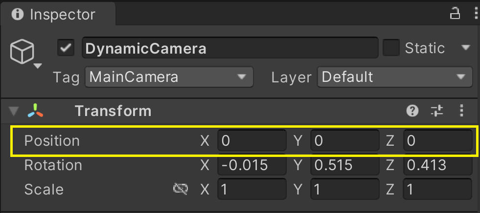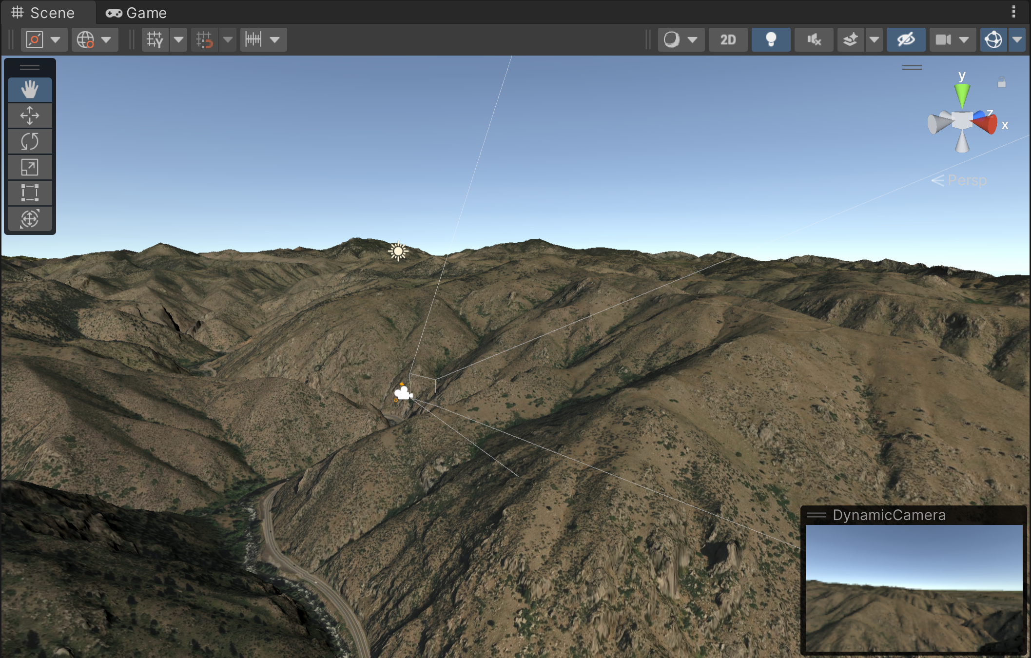 3. Select the DynamicCamera in the Hierarchy window. Since the camera has a CesiumGlobeAnchor, it will have been left behind at the Denver hills. You can bring the camera to the origin of the sub-scene by setting its Position to (0, 0, 0).