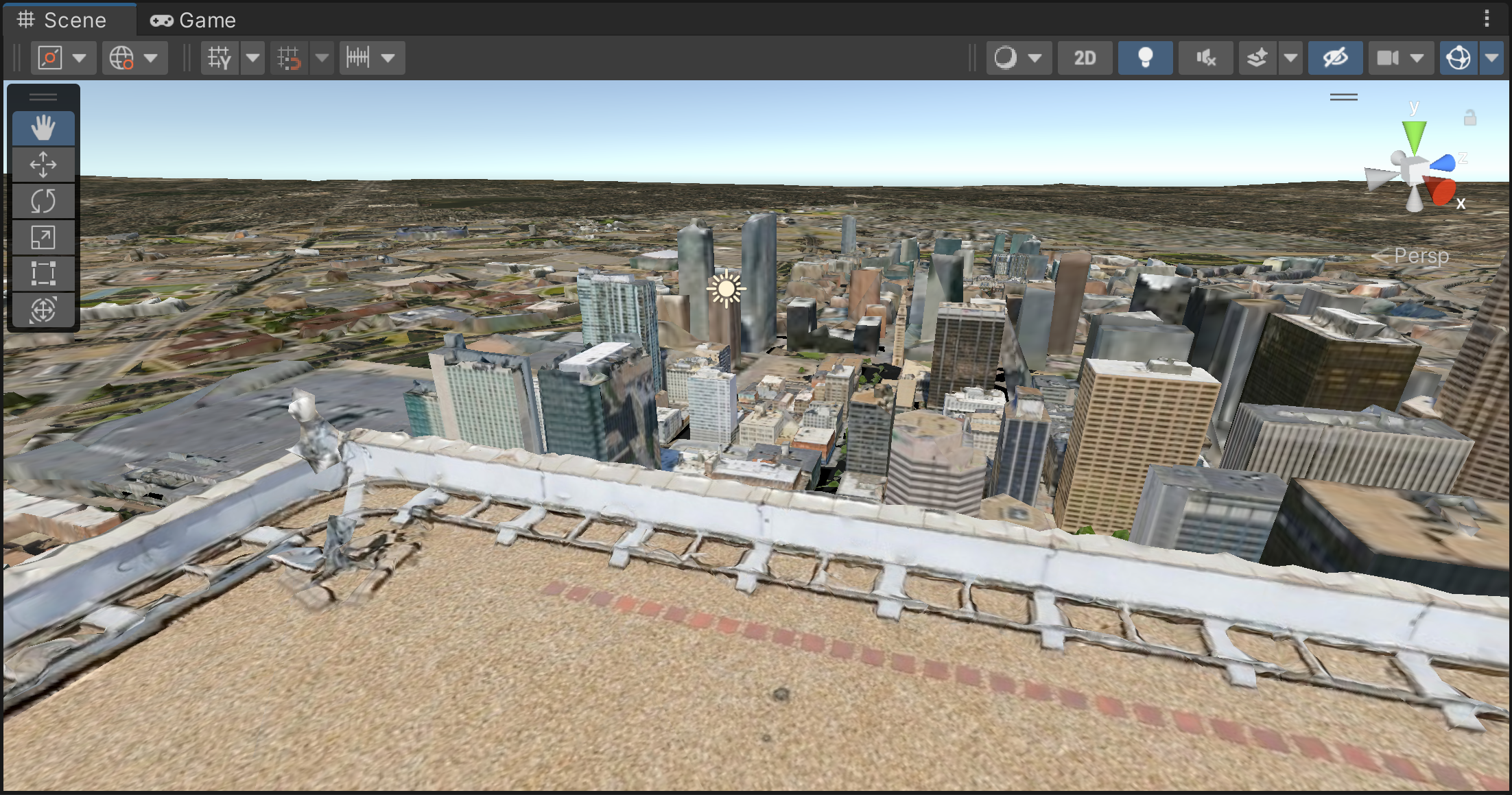 Using the arrow keys and mouse, move the camera in the Scene View to a distinctive location on the tileset. If you need help navigating the scene in the Editor, take a look at Step 6 of the Quickstart tutorial. This tutorial will use the rooftop of one of the tallest buildings in the tileset.