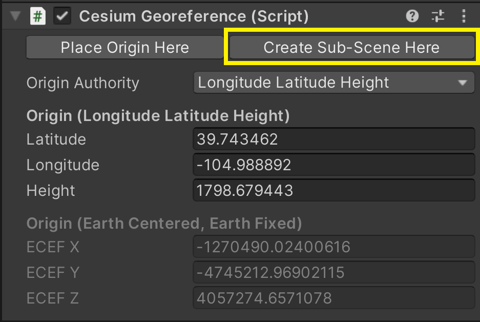 2. Click on the CesiumGeoreference in the Hierarchy window. Then, in the component’s Inspector window, click on the button labeled Create Sub-Scene Here.