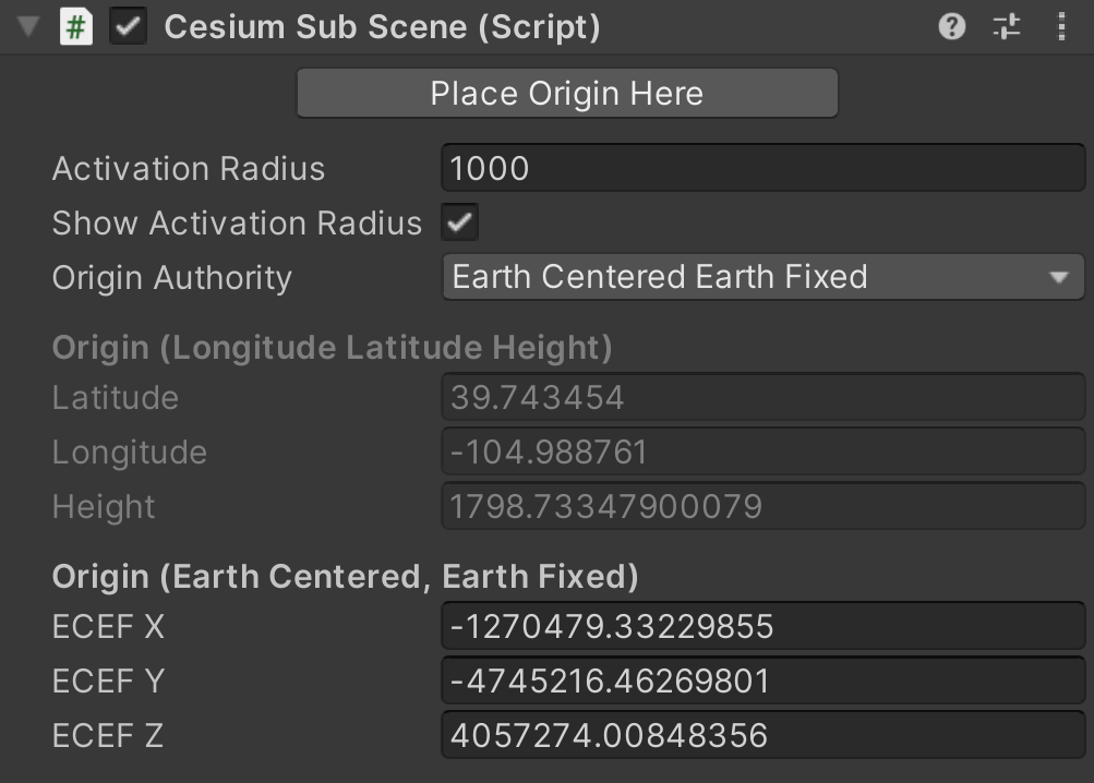 Then, in the Inspector, find the CesiumSubScene component and use these coordinates for the origin: