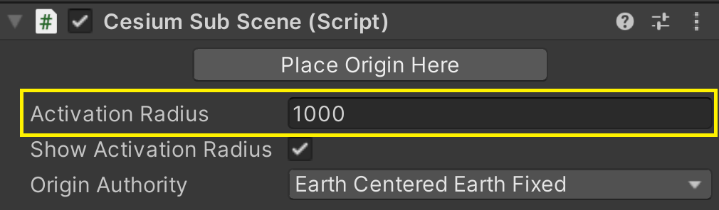 The CesiumSubScene component represents a georeferenced sub-scene in Cesium for Unity. Whenever Create Sub-SceneHere is clicked, it converts the position of the Editor camera to global coordinates, then sets them as the origin of the new sub-scene. This also sets the origin of the CesiumGeoreference to the same value. In fact, whenever you enter a sub-scene’s activation radius, it automatically sets the georeference origin to be the origin of the sub-scene. This radius is visualized by a wireframe sphere in the Scene View whenever the Show Activation Radius checkbox is checked.