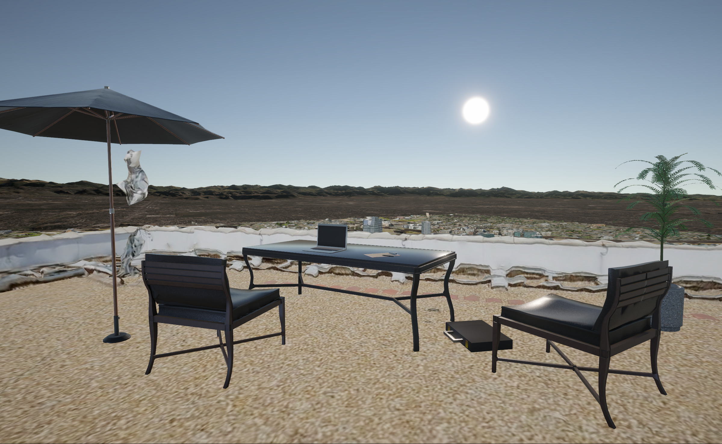 The following assets from the Unity Asset Store were used to build this rooftop sub-scene: Patio chair, Patio table, Colored Parasols, Low-Poly Office Props - LITE, PBR Floweringpot 01, (PBR) Low-Lying Plant Pack, Clipboard.