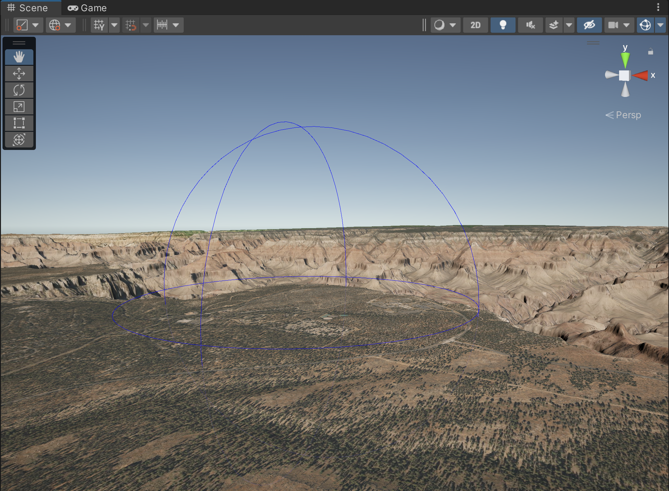 These complications can be addressed by limiting where physics and other complex simulations occur, and only enabling them close to the user’s location. Generally, global content can be organized as multiple local scenes that are only enabled when a user enters them. This is possible in Cesium for Unity through the use of georeferenced sub-scenes. Georeferenced sub-scenes allow users to define global locations for groups of objects across the world. Each sub-scene defines a central location and a radius that surrounds its contents, with the intent to simulate an ordinary Unity scene inside them while placing them in a global context.