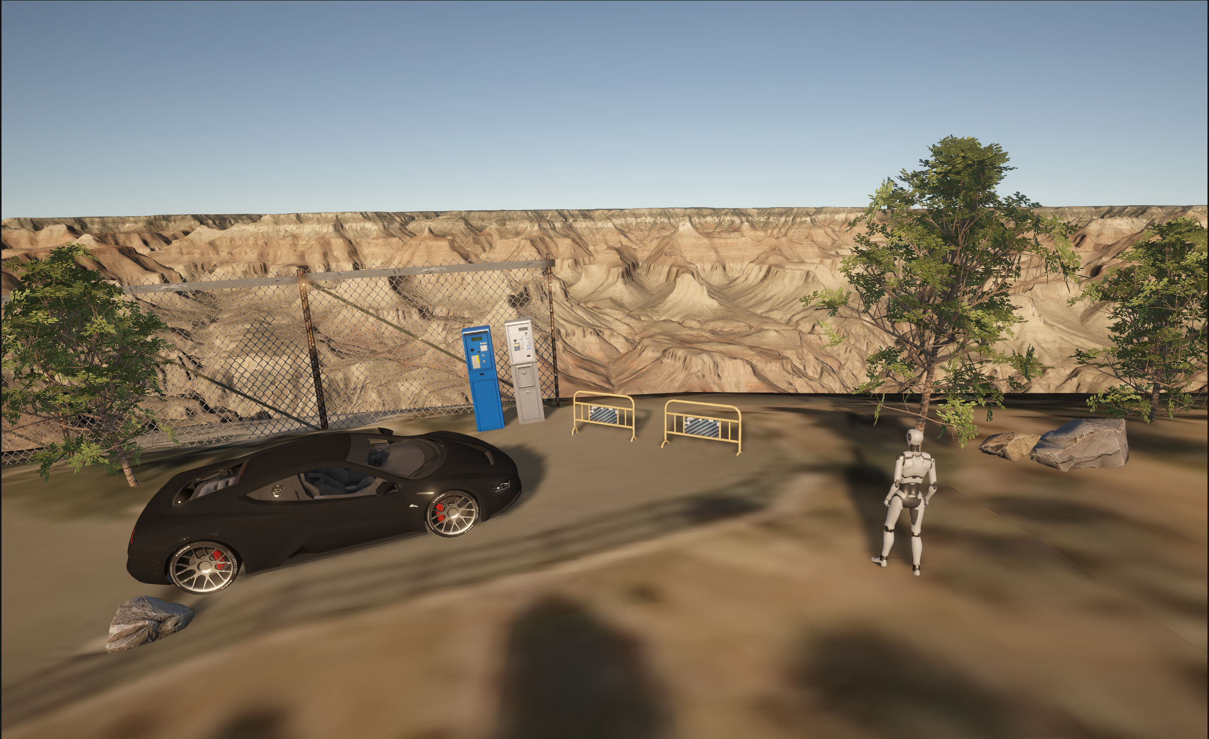 This Grand Canyon sub-scene was made with the following assets from the Unity Asset store: HQ Racing Car Model No.1203, Realistic Tree Pack Vol. 1, Modular Fences Pack, Parking Meter, Rock package, and Starter Assets - Third Person Character Controller.